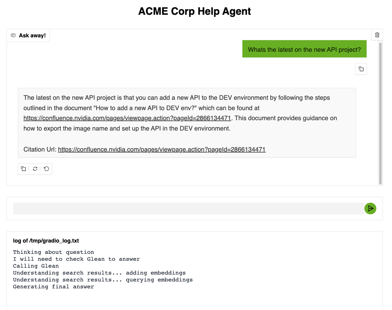 This article shows you how to create an agent using NVIDIA NIM™ and Glean that can answer user questions about an internal company knowledge base. Some example user questions are: